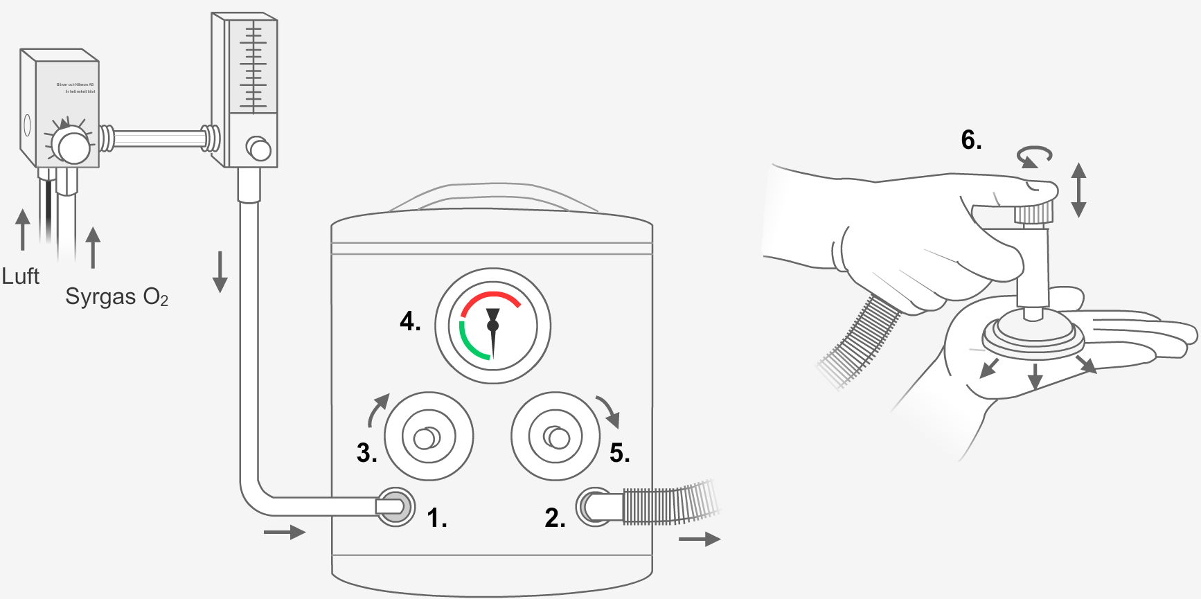 - släpp fingret från utloppsventilen (6), och kontrollera att tryckvisaren visar korrekt motstånd (vanligen 4-5 cmH2O). Justera annars genom att skruva på utloppsventilen