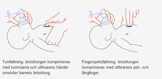 - ”Tumteknik” –utföraren fattar med båda händerna om barnets bröstkorg med tummarna placerade på bröstbenets nedre tredjedel och fingerspetsarna vid ryggraden (se figur nedan). Rekommenderades, då den är mest effektiv och genererar ett högre blodtryck och bättre koronargenomblödning än ”fingertekniken”